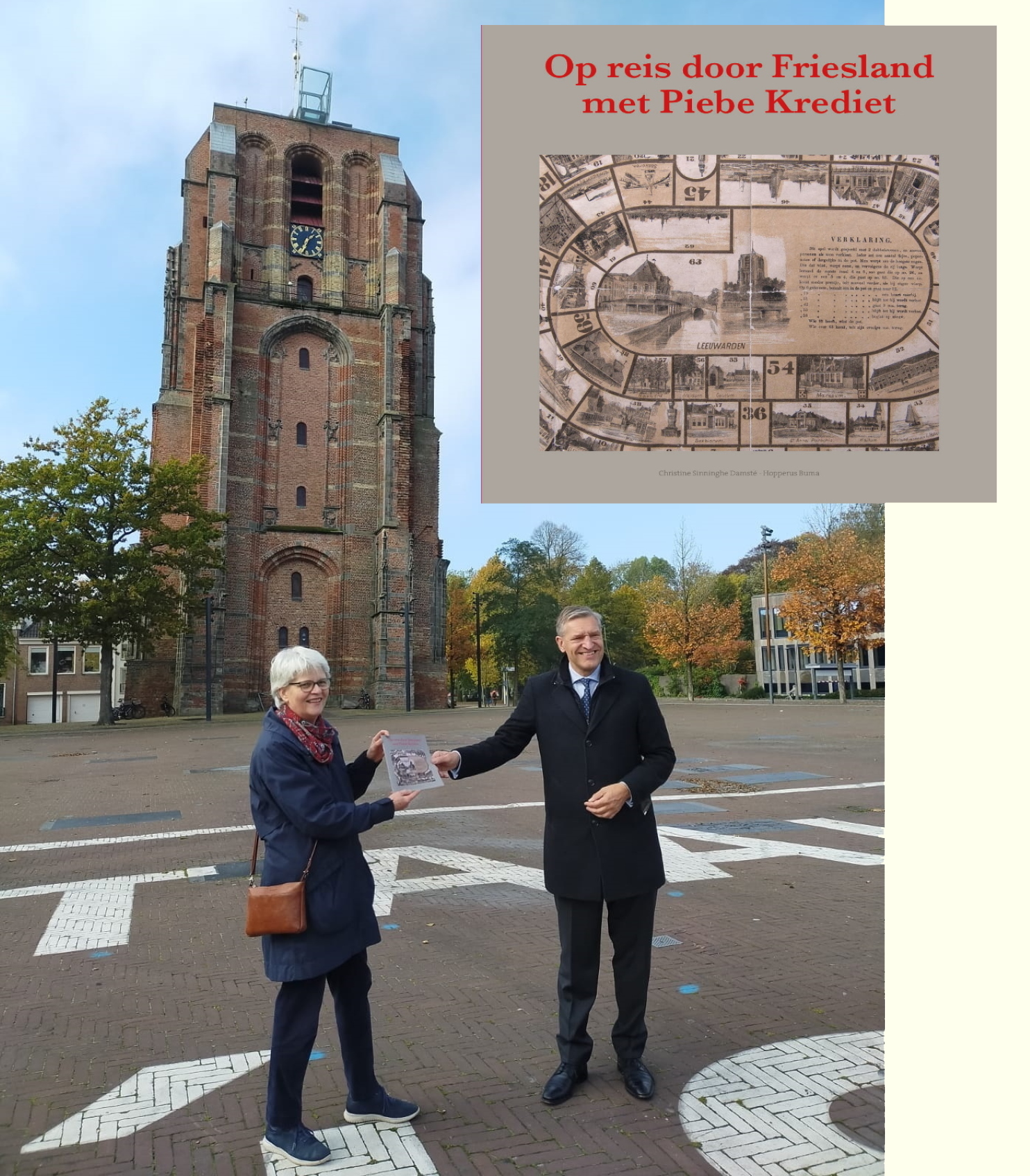 Christine Sinninghe Damsté uit Hengelo is een verzamelaar en kenner van oude ganzenborden. Zij heeft Friese wortels – haar meisjesnaam is Hopperus Buma – en Piebes speelse elf-en-dertig tocht intrigeerde haar. Zij ontleedde de plaatjes in historische wetenswaardigheden die ze bijeenbracht in een onlangs verschenen boekje. Het is opgedragen aan Bernard Buma, de in juni overleden vader van de burgemeester van Leeuwarden. De bedoeling was dat Sybrand Buma het eerste exemplaar in ontvangst zou nemen op een presentatie in het Historisch Centrum Leeuwarden, maar corona haalde een streep door de rekening. In plaats daarvan overhandigde de auteur hem het eerste exemplaar tijdens een informele ontmoeting in de buitenlucht, voor de Oldehove. Het in eigen beheer uitgegeven Op reis door Friesland met Piebe Krediet is via christinedamste@home.nl te bestellen voor € 10 plus verzendkosten. In Leeuwarden is het te koop bij de Fryske Kado- en Boekwinkel van de Afûk, Boterhoek 3 en het Historisch Centrum Leeuwarden, Groeneweg 1. Begin 2021 verschijnt een artikel over dit bijzondere ganzenbord in het historisch tijdschrift Fryslân.