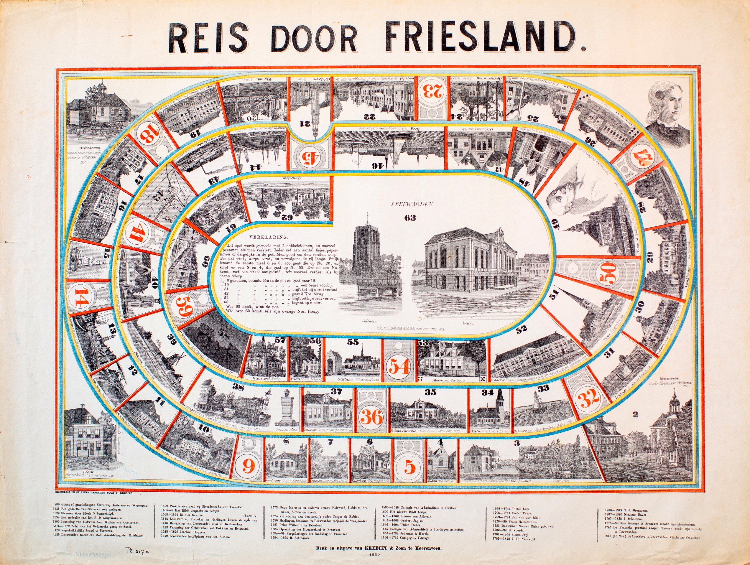 Na zijn opleiding tot steendrukker wilde Piebe Krediet (1855-1936) uit Heerenveen een meesterproef afleveren in de vorm van een bijzonder ganzenbord. Het eeuwenoude spel heeft een spiraalvormig stramien met 63 vakjes, waarop de speler te maken krijgt met allerlei mee- en tegenvallers. Piebe besloot een ganzenbord te ontwerpen in de vorm van een reis door Friesland – waarvoor hij, waarschijnlijk in 1879, eerst zelf een lange voetreis door de provincie maakte. Tijdens zijn zwerftocht maakte hij tekeningen die hij na afloop overzette op de steen. In de zomer van 1880 verscheen zijn ‘Reis door Friesland’, die werd herdrukt in 1889 en 1900. De traditionele spelelementen vertaalde hij in Friese locaties: de Bonifatiusfontein in Dokkum doet op nummer 31 dienst als de put waaruit je moet worden verlost, en op nummer 58 markeren de mummies van Wieuwerd de dood die dwingt van voren af aan te beginnen. De reis vangt aan in Heerenveen en eindigt na een lange omweg in Leeuwarden. De hoofdstad staat in het hart van het spel, geïllustreerd met de Oldehove en het in 1880 voltooide Beursgebouw op het Zaailand.