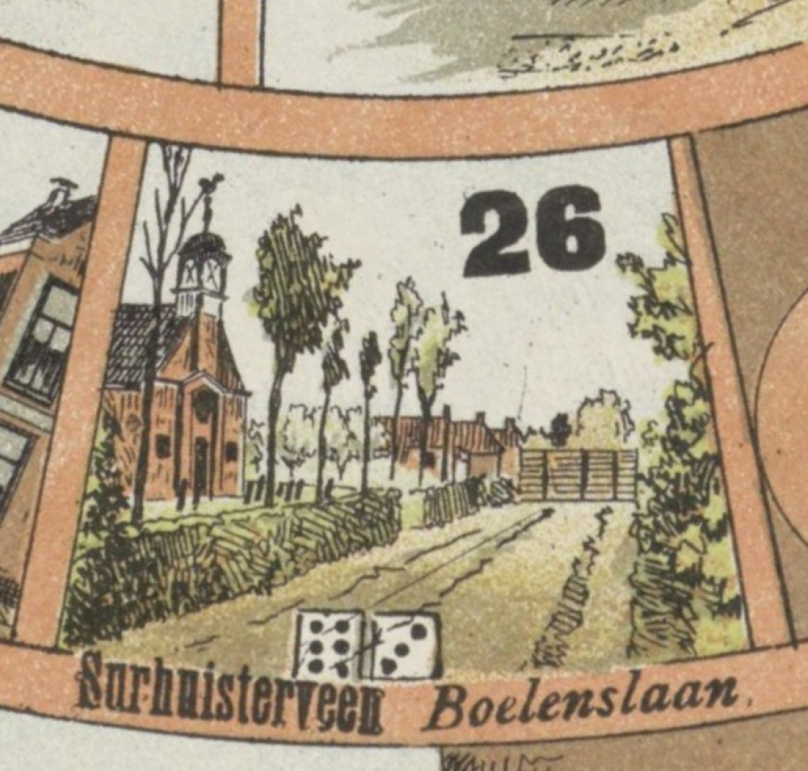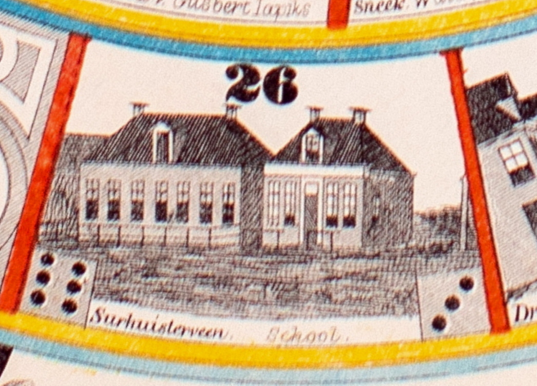 Surhuisterveen is nummer 26 op dit Friese ganzenbord uit 1880. Het dorp wordt voorgesteld door de lagere school, waar in 1879 een geruchtmakende turfkwestie speelde. Hoofdmeester Westerling werd beschuldigd van het verduisteren van schoolturf. In het veen kijkt men anders niet op een turfje, zou je denken. Het liep hoog op en werd een rechtszaak die landelijk aandacht kreeg en waarin Westerling uiteindelijk werd vrijgesproken. Bij een latere editie van het spel uit 1900 was die kwestie verouderd en werd Surhuisterveen voorgesteld door het kerkje van Boelenslaan.